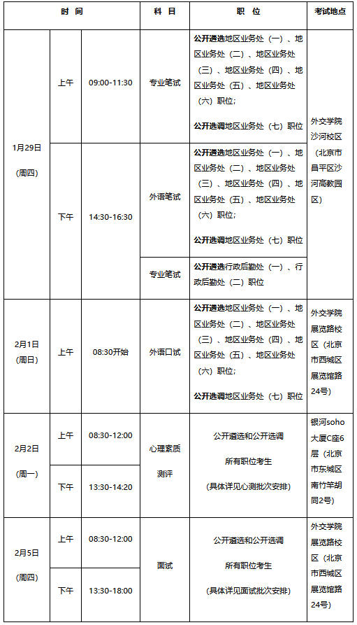 考试期间考生须全程携带我部职位业务水平测试和面试准考证,请于1月26日后登录考试报名确认系统(https://kaolu.mfa.gov.cn),下载打印准考证,并根据准考证号查看具体考试批次、场地等安排。